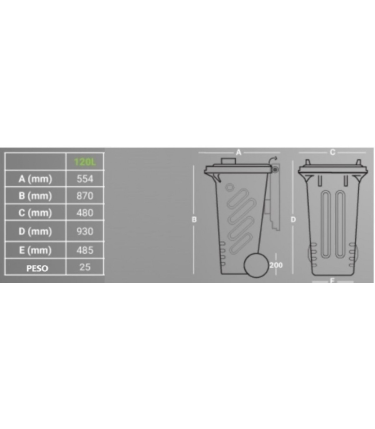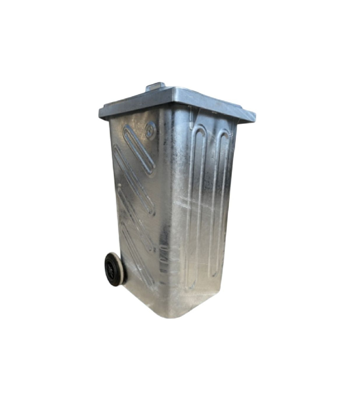 Este contenedor está fabricado en acero galvanizado en caliente (DC01), lo que le otorga una alta resistencia a temperaturas extremas y a la corrosión. Su diseño incluye ruedas estampadas de caucho macizo para facilitar su desplazamiento, así como asas posteriores ergonómicas para un manejo más cómodo.