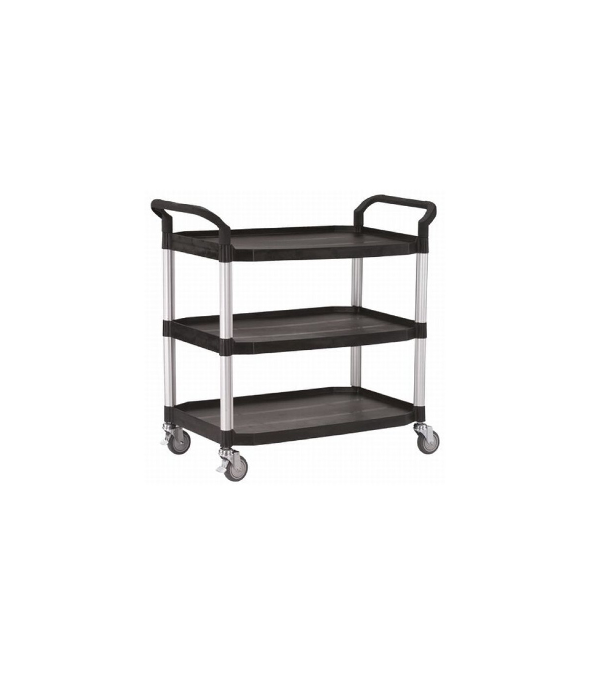 Carro de plástico con tres estantes resistentes y fondo, ideal para el transporte y almacenamiento de diversos artículos. Sus dimensiones son 680 x 450 mm, con una superficie lisa y duradera. Diseñado para entornos como hoteles, comedores y restaurantes. Soporta hasta 150 kg y cuenta con cuatro ruedas de goma giratorias para un desplazamiento ágil y seguro.