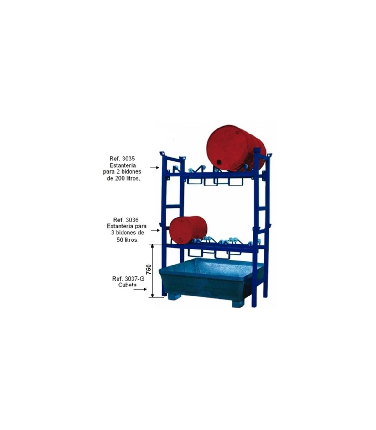 Plataforma diseñada para contener y apilar hasta 2 bidones de 200 litros, con la capacidad de apilarse hasta 3 alturas. Fabricada en acero perfilado de alta resistencia, esta plataforma ofrece una capacidad de carga de 800 kg. Cuenta con 4 ruedas de nylon por cada bidón, lo que facilita la rotación de los mismos. Se recomienda el uso del accesorio 3058 para un mejor rendimiento. La plataforma se suministra desmontada y también se conoce como estantería de almacenamiento.