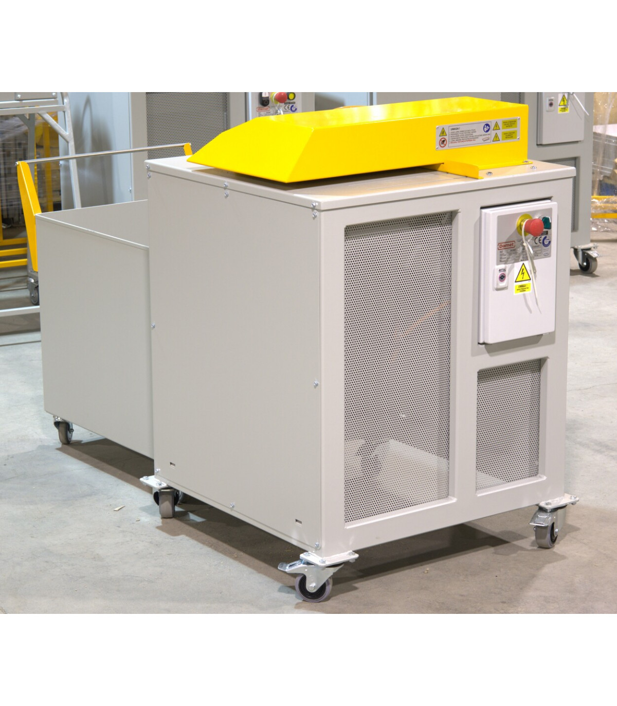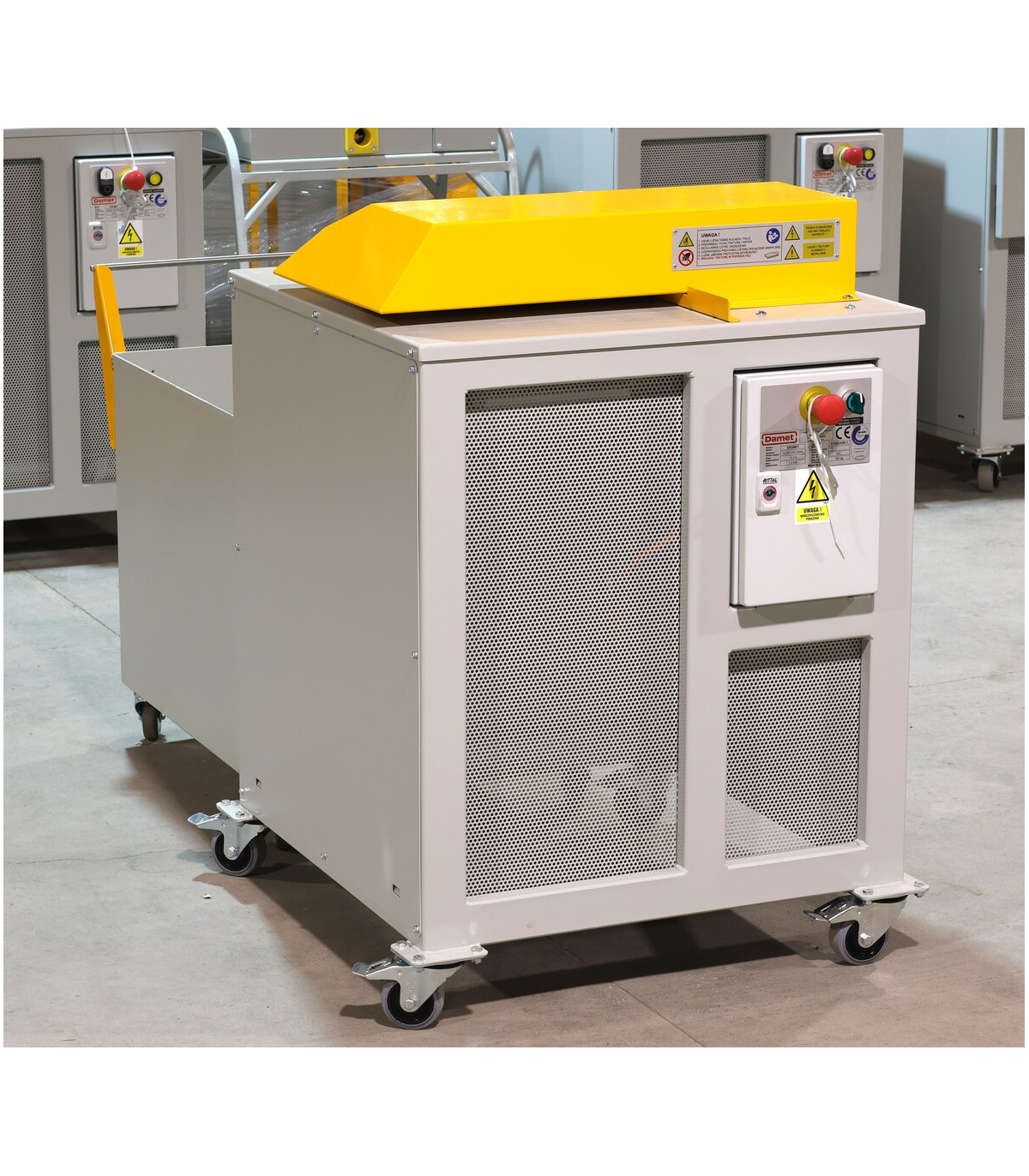 La máquina se puede mover libremente gracias a su sistema de ruedas. El diseño del dispositivo garantiza su compatibilidad con los carros de relleno, lo que aumenta significativamente la eficiencia de los procesos de transporte y almacenamiento del relleno. El diseño del dispositivo cuenta con una toma para conectar un aspirador industrial, que elimina eficazmente el polvo del relleno producido, lo que aumenta significativamente su calidad.